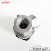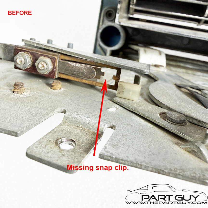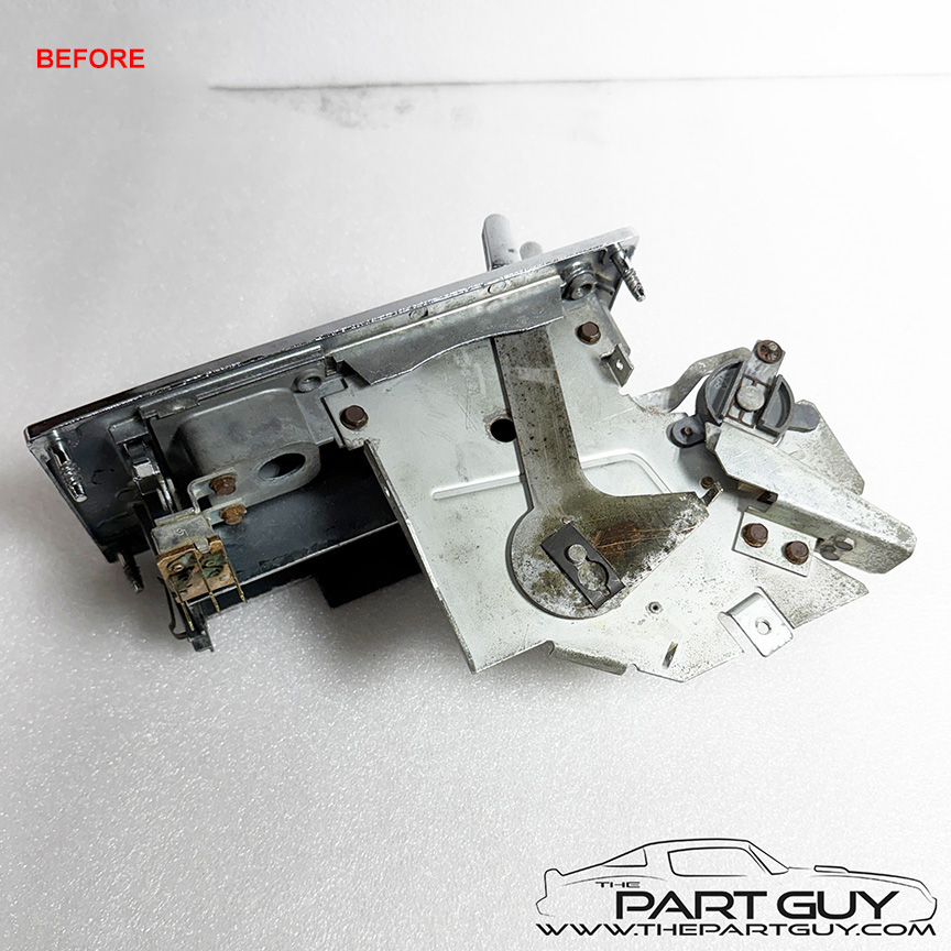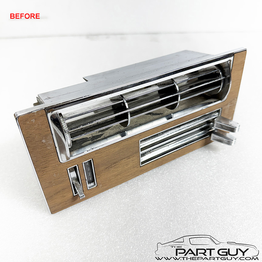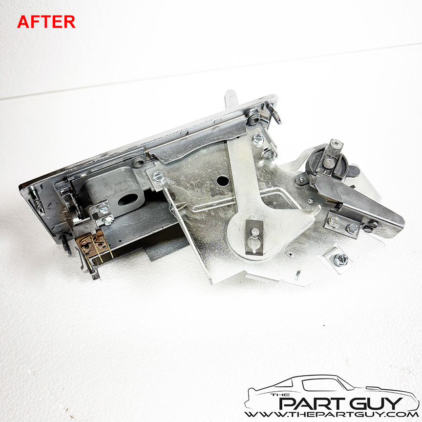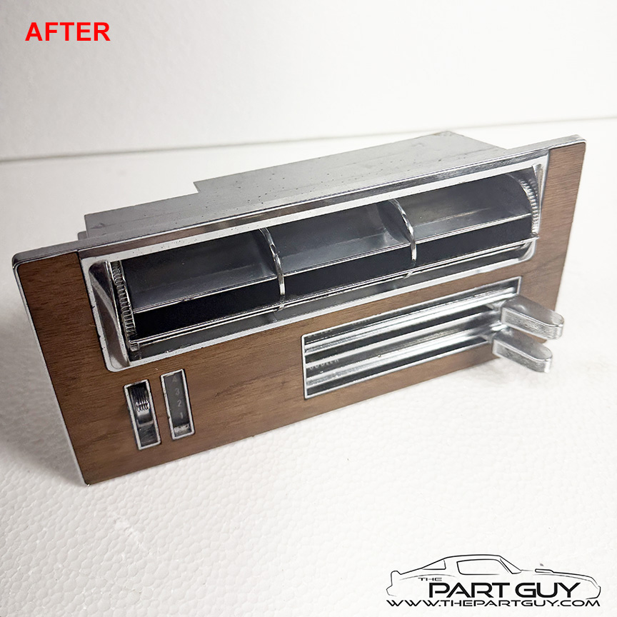 The entire control was completely dismantled. Each lever was cleaned, bead-blasted & painted and slide smoothly; one lever was replaced. Plastic sliders were replaced as needed. The fan switch was acid cleaned, lubricated & tested to function correctly. The chrome knobs were in rough condition, so new billet knobs were installed. The chrome bezel was detailed and a new lens with green lettering was installed. NOTE - Fits 1964-65 Chevelle & El Camino with factory air-conditioning. |