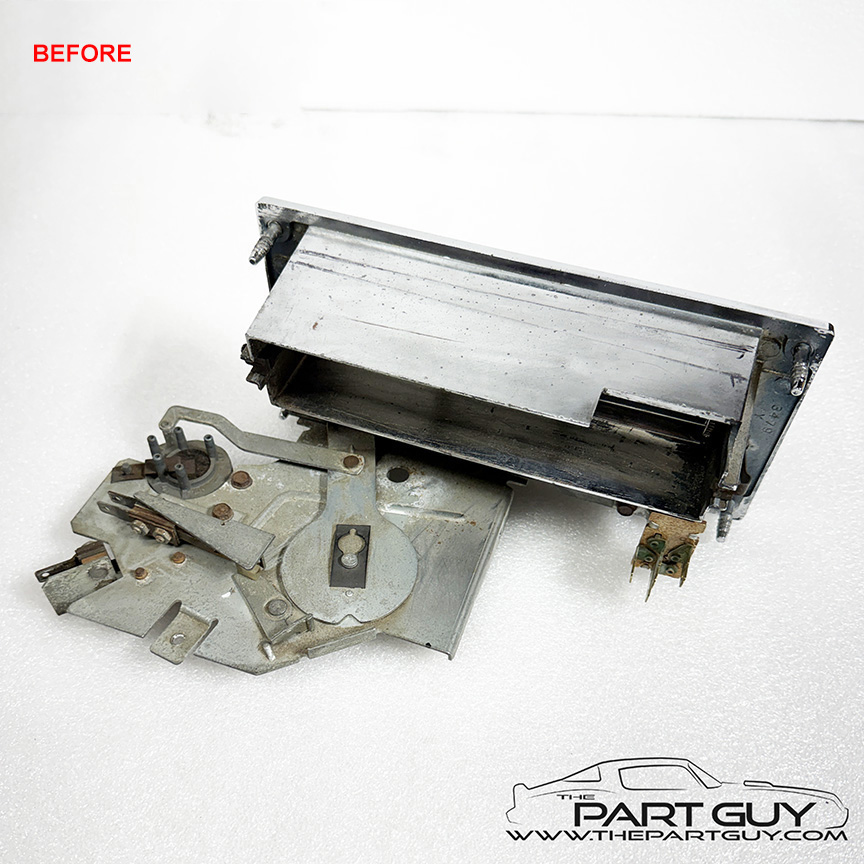 The vacuum mode, fan/blower speed & master switches were acid dipped/cleaned, lubricated and tested to function correctly. The body, often tweaked out of shape, was straightened. Broken lever tips were been replaced. Knobs were buffed out and/or replaced as needed. The chrome bezel was detailed and a new lens with green lettering was installed. NOTE - FITS 69 Camaro & 1969-70 Nova with factory air-conditioing. Also fits 1971-74 Nova, but a lens with white lettering is used. |